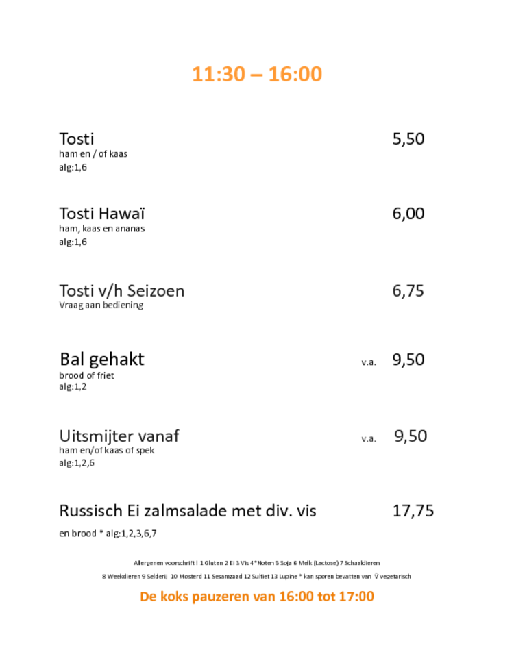 Onze lunchkaart, is een kaart die geheel aansluit op de wensen van de hedendaagse gast, met hier en daar een knipoog naar die goeie ouwe tijd. Ook hebben wij ons laten inspireren door onze jongere gasten. Zij gaven aan dat ze het broodje carpaccio misten, uiteraard hebben we deze toegevoegd maar dan wel van het beste vlees waardse rund. Wat te denken van de salade van gerookte zalm. Geitenkaas van boerderij Mooimekkerland. Een ouderwetse klassieker, kippenlever met spek ui en champignons. Natuurlijk hebben we gedacht aan de snelle zakenman met zijn heerlijke uitsmijters met bijv kaas uit de Krimpenerwaard van boerderij Schep en de heerlijke kroketten van Oma's Bob op brood of met friet. Ook serveren wij flamkúchen, deze is ook vegetarisch verkrijgbaar.