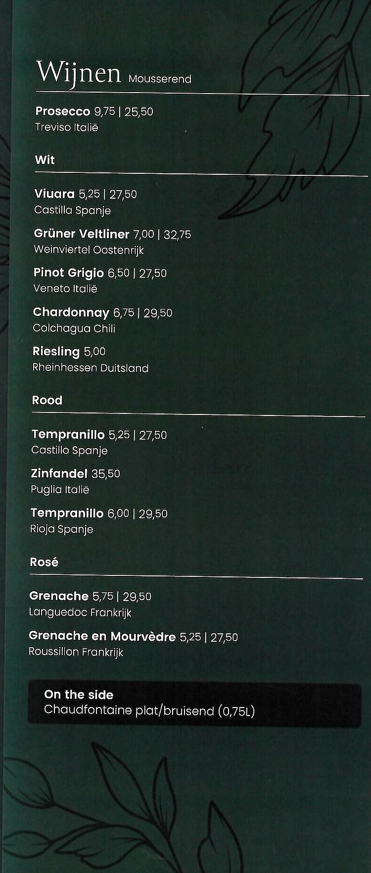 In samenwerking met onze wijnleverancier Hanos zijn wij tot een mooie wijnkaart gekomen waar het gaat om de smaak en uiteraard de betaalbaarheid. met de sommelier van Hanos hebben we mooie wijnen weten te creéren, die goed bij onze menukaart passen. Of gewoon om het terras en onze overdekte serre. Wijnen daar je raak er niet overuitgepraat, kom en proef.